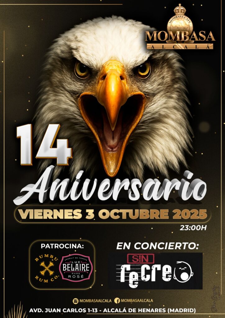 👉 Este viernes 3 de Octubre celebramos nuestro 14º Aniversario 🦅🥂🎸 con el concierto en vivo de Sin Recreo, el mejor Pop Rock de los 80 y 90 desde las 23:00 h, Con el patrocinio de Bumbu Rum Co. y Luc Belaire🍹. Después del concierto la fiesta continua con Nika García Dj 🍾